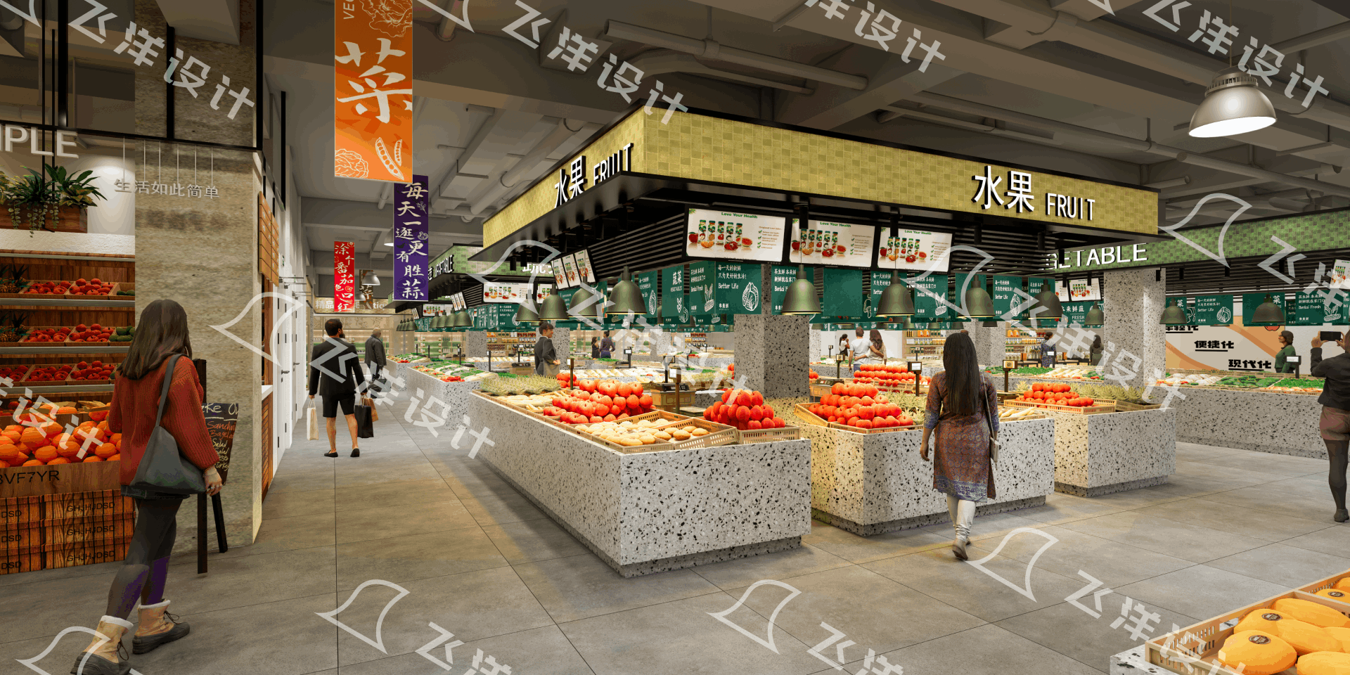 蔬果區(qū):近入口,色彩明亮、氣味清 新,吸引客流。