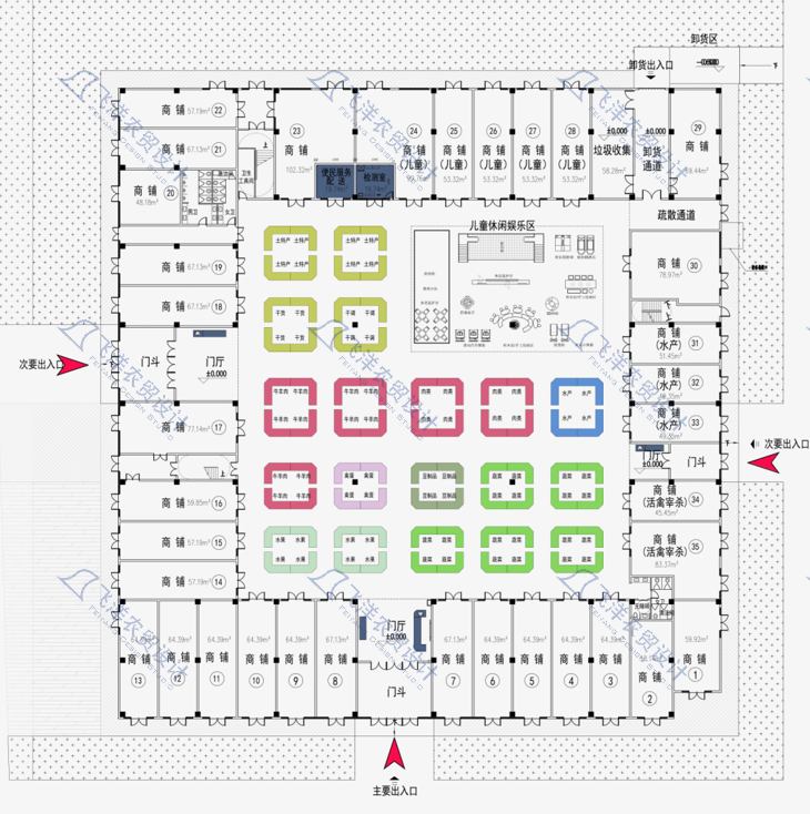 核心層(農(nóng)貿(mào)):嚴(yán)格遵循“劃行歸市”,以鮮明的色彩標(biāo)識(shí)系統(tǒng)(果蔬綠、肉類橙、水產(chǎn)藍(lán))集中布局生鮮業(yè)態(tài),保障交易效率與基礎(chǔ)客流。