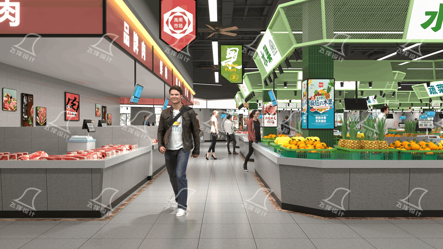 入口大廳采用木質(zhì)格柵天花與線性燈帶打造 “會客廳” 儀式感;生鮮區(qū)通過綠色金屬網(wǎng)格吊楣 + 品類標(biāo)識,實(shí)現(xiàn) “按圖索驥” 式購物體驗(yàn)。