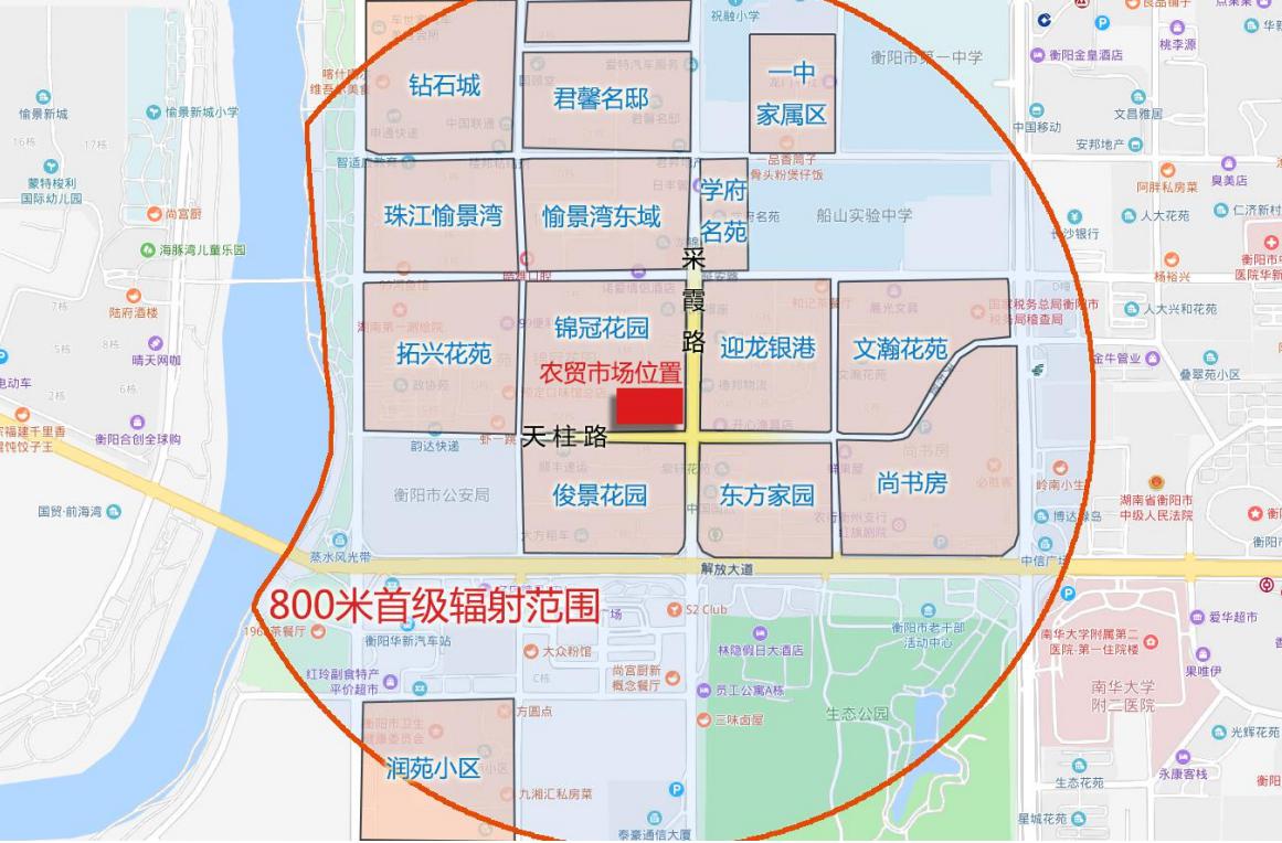 (上圖為湖南某地一個(gè)典型的圍繞住宅小區(qū)的農(nóng)貿(mào)市場(chǎng),周邊800米輻射范圍內(nèi)有10余個(gè)住宅區(qū),其中包含2個(gè)學(xué)區(qū)。定位為典型的社區(qū)配套型便民農(nóng)貿(mào)市場(chǎng)。)