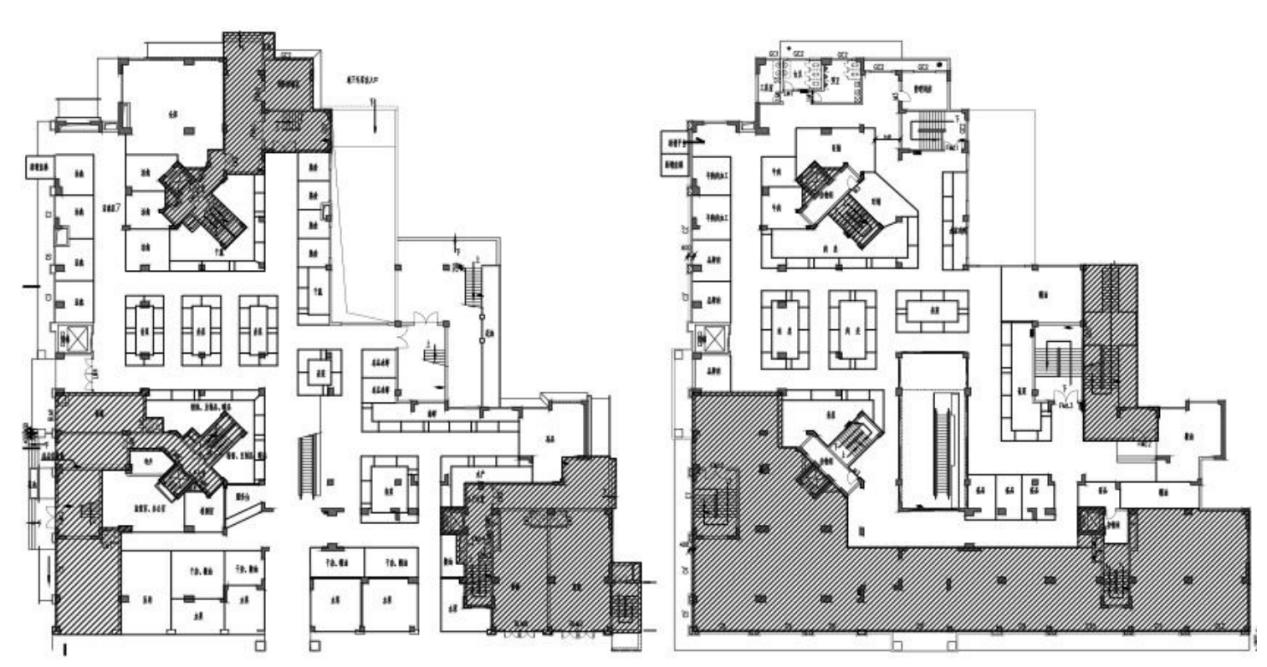 (上圖為廣西某市場(chǎng)的布局,所在建筑為6層住宅,農(nóng)貿(mào)市場(chǎng)經(jīng)營(yíng)范圍為1-2層的局部,經(jīng)營(yíng)范圍內(nèi)被樓梯間、剪力墻等分割為凌亂的多個(gè)部分,導(dǎo)致該市場(chǎng)經(jīng)營(yíng)效果不佳,死角極多,是一個(gè)反面案例。)