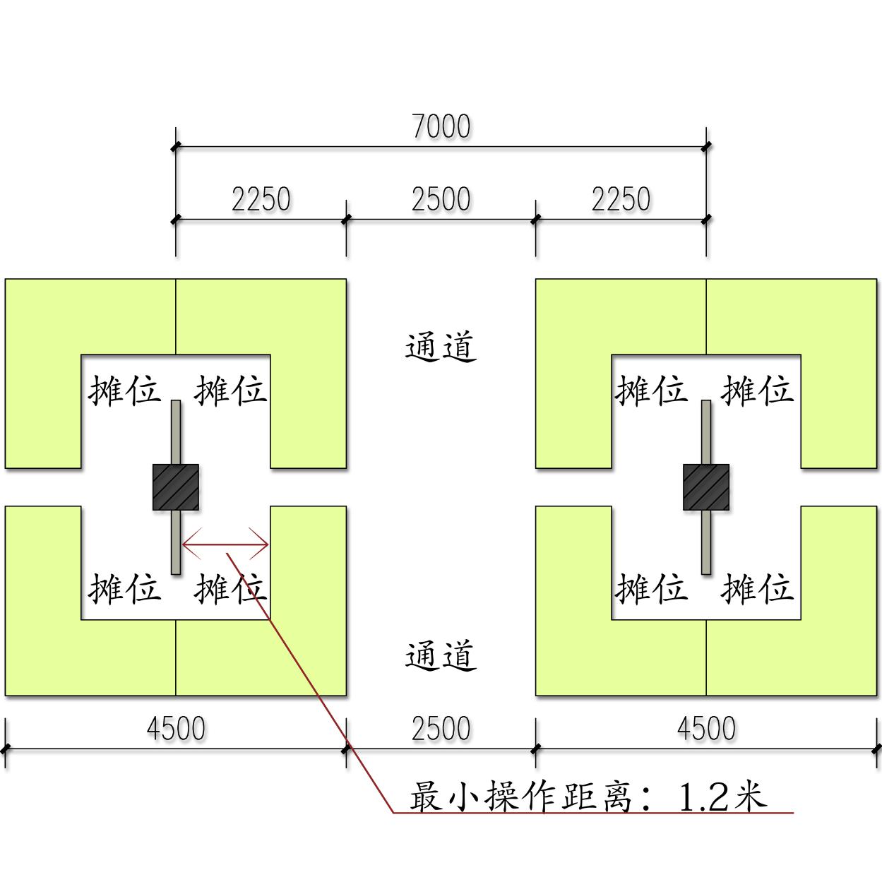 (如上圖所示,以攤位最小操作距離1.2米逆向推算,兩柱子的最小距離為7米)
